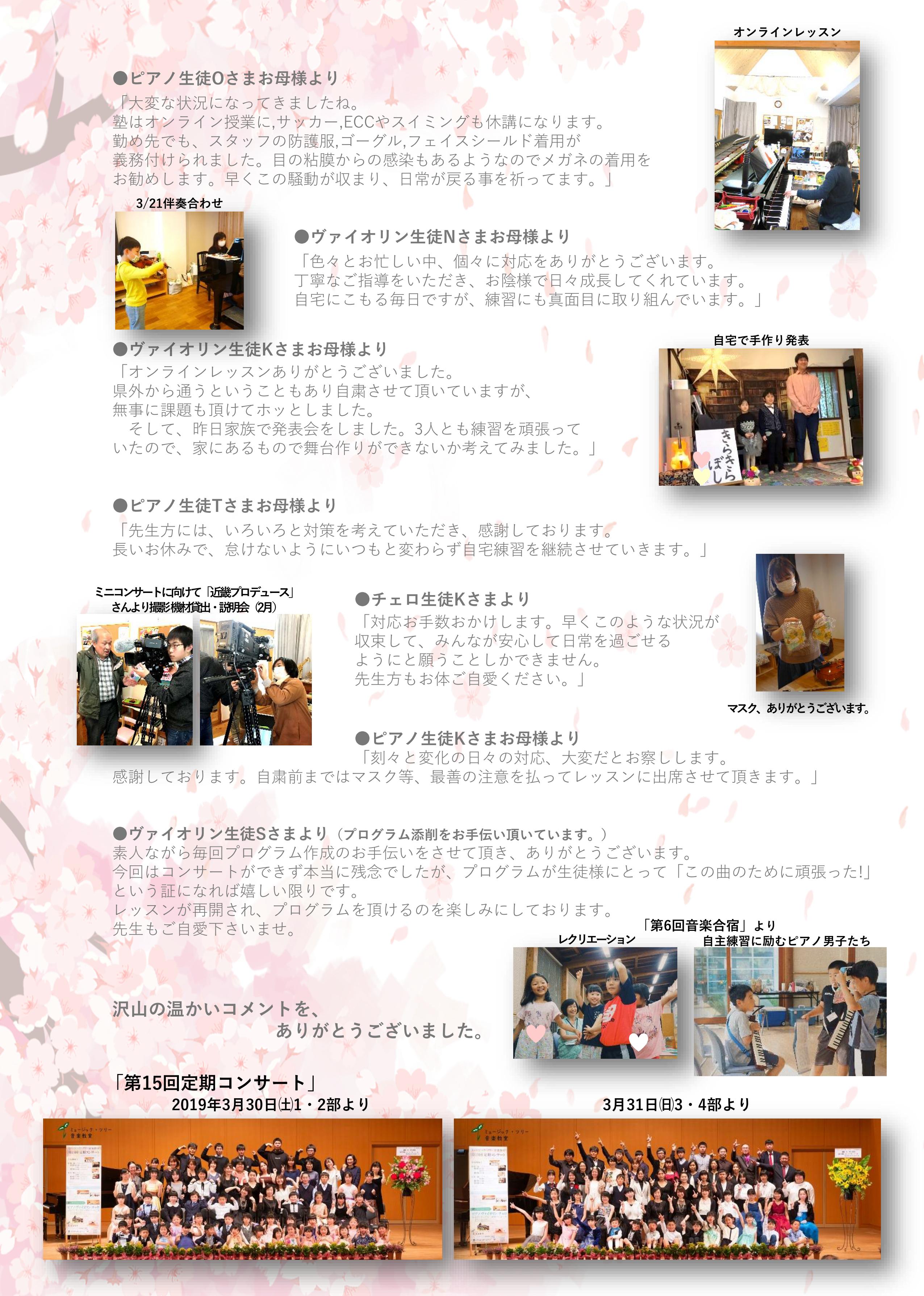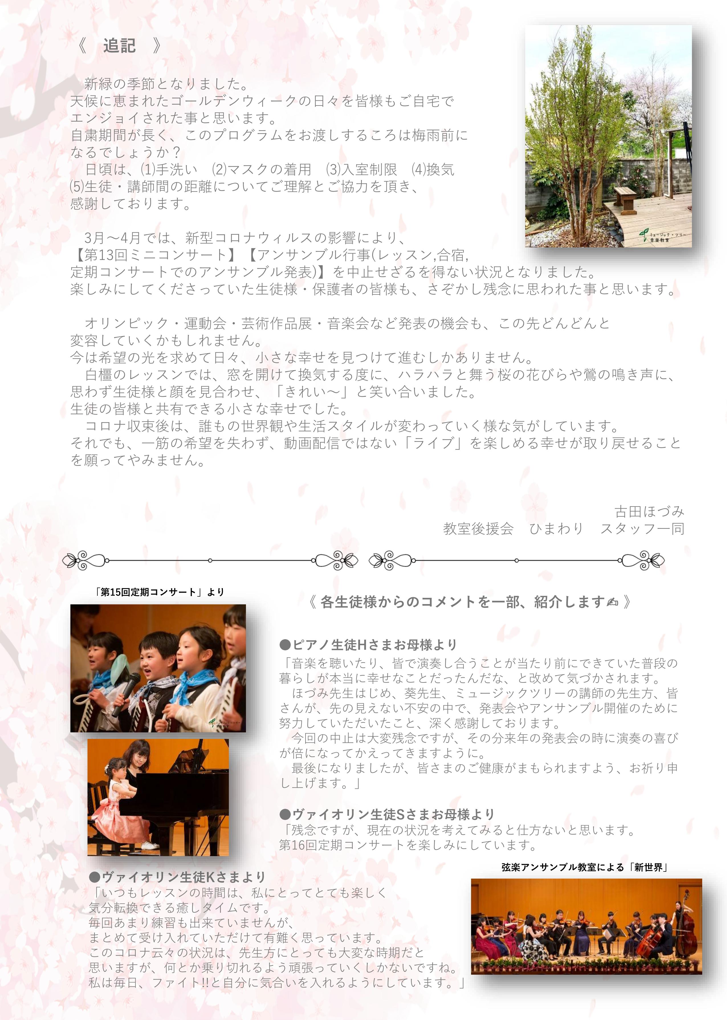 今回の中止は大変残念ですが、その分来年の発表会の時に演奏の喜びが倍になってかえってきますように。最後になりましたが、皆さまのご健康がまもられますよう、お祈り申し上げます。」